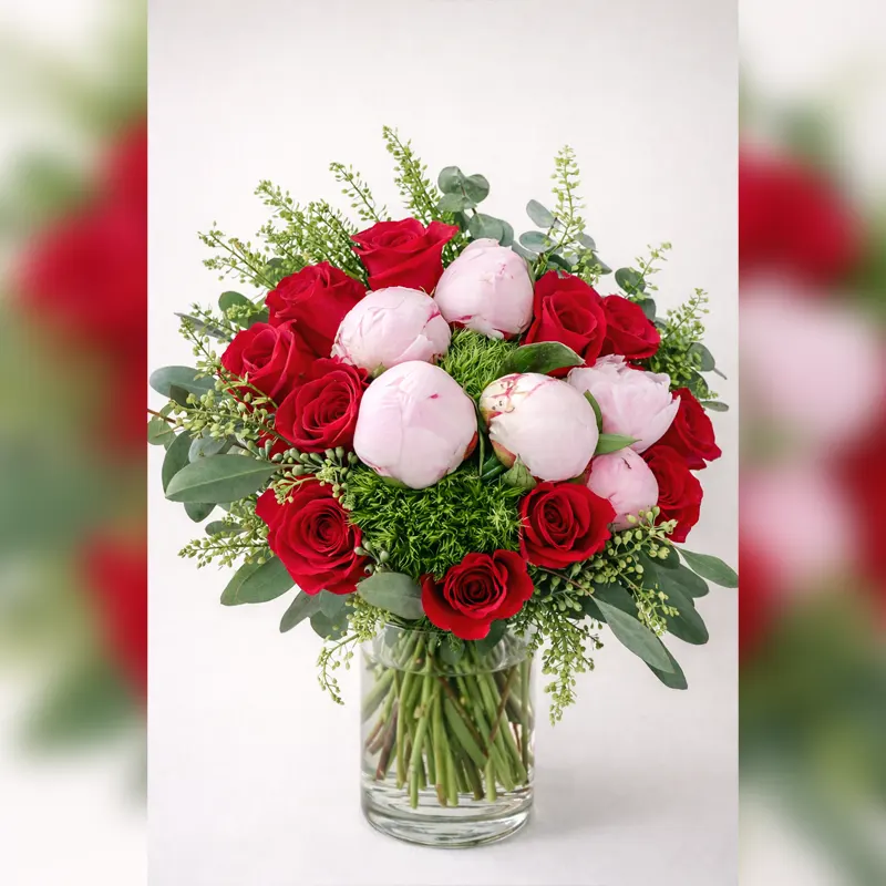 Some loves are constant. Some choices are certain. It’s Always You is a romantic, expressive arrangement designed for moments that matter. Featuring lush pink peonies paired with twelve premium red roses, this piece is softened with eucalyptus and layered seasonal greenery for a full, garden- inspired look. For the love that is constant, steady and sure. This one is for you. 6 peonies, 12 premium red roses, lush assortment of eucalyptus and fillers, deluxe cylinder vase. Quiet luxury at its finest.