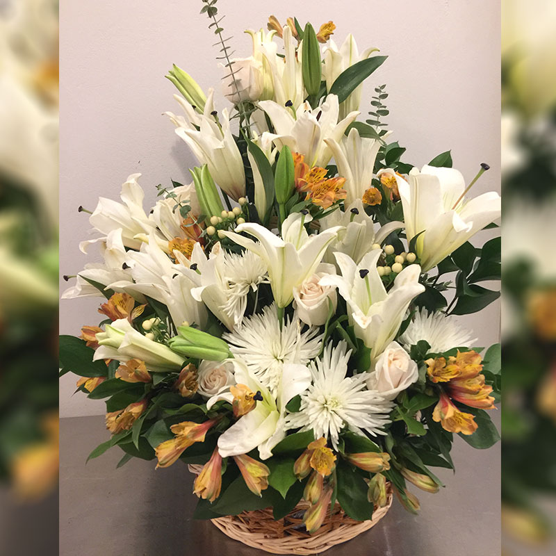 Deluxe basket arrangement of white lilies and roses, gold alstromerias, white mini roses and more
