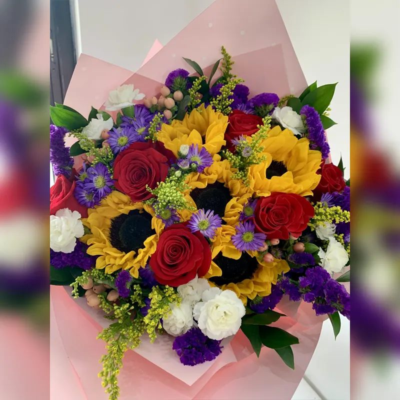 A vibrant and cheerful bouquet featuring bold sunflowers, classic red roses, and a mix of colorful seasonal blooms, beautifully accented with fresh greenery. Wrapped in soft blush tones, this lively arrangement is designed to bring warmth, happiness, and a bright smile—perfect for celebrating Mom.