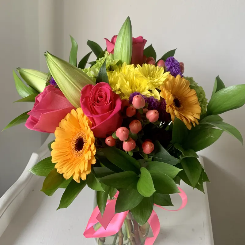 A cheerful mason jar arrangement featuring a vibrant mix of designer’s choice blooms in bright, uplifting tones. Accented with fresh greenery and finished with a soft ribbon detail, this sweet and colorful piece is perfect for bringing a smile to Mom’s face and brightening her day.