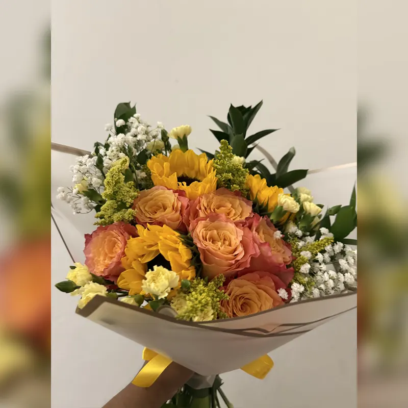 A cheerful hand-tied bouquet featuring radiant sunflowers paired with warm peach roses, soft accent blooms, and fresh greenery. Wrapped in a soft neutral tone with a coordinating ribbon, this bright and uplifting arrangement is designed to bring joy, warmth, and a beautiful smile to Mom’s day