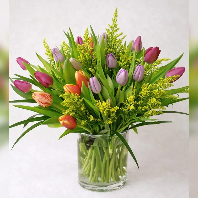 For the one who feels like the whole world. My Everything is a striking tulip arrangement created for the well- travelled, the romantic, and those who appreciate refined simplicity. Featuring fifty premium tulips in a rich, curated mix of seasonal hues, this arrangement is softened with fresh greenery and delicate solidago for movement and texture. Designed in a clear glass vase, My Everything allows the tulips to drink, stretch, and continue to bloom beautifully over time — a living expression of love that grows with each passing day.