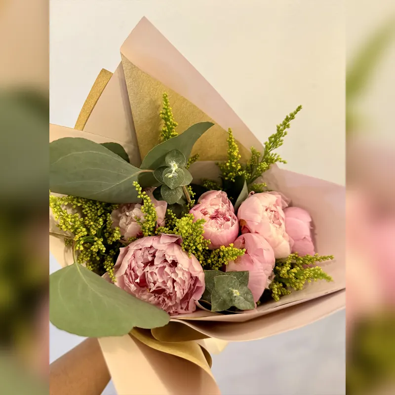 A beautifully refined wrapped bouquet featuring six lush peonies in soft blush tones, accented with fresh eucalyptus and delicate seasonal fillers. Designed with simplicity and elegance, this bouquet highlights the natural beauty and fullness of each bloom—creating a soft and graceful gesture that feels both luxurious and heartfelt for Mom.