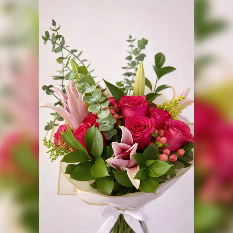 Modern, expressive, and quietly captivating. Something About You features six vibrant hot pink roses paired with elegant lily blooms, playful hypericum berries, and soft eucalyptus for balance and texture. Wrapped simply and styled with intention, this bouquet is designed for those who love colour, confidence, and a contemporary take on romance.